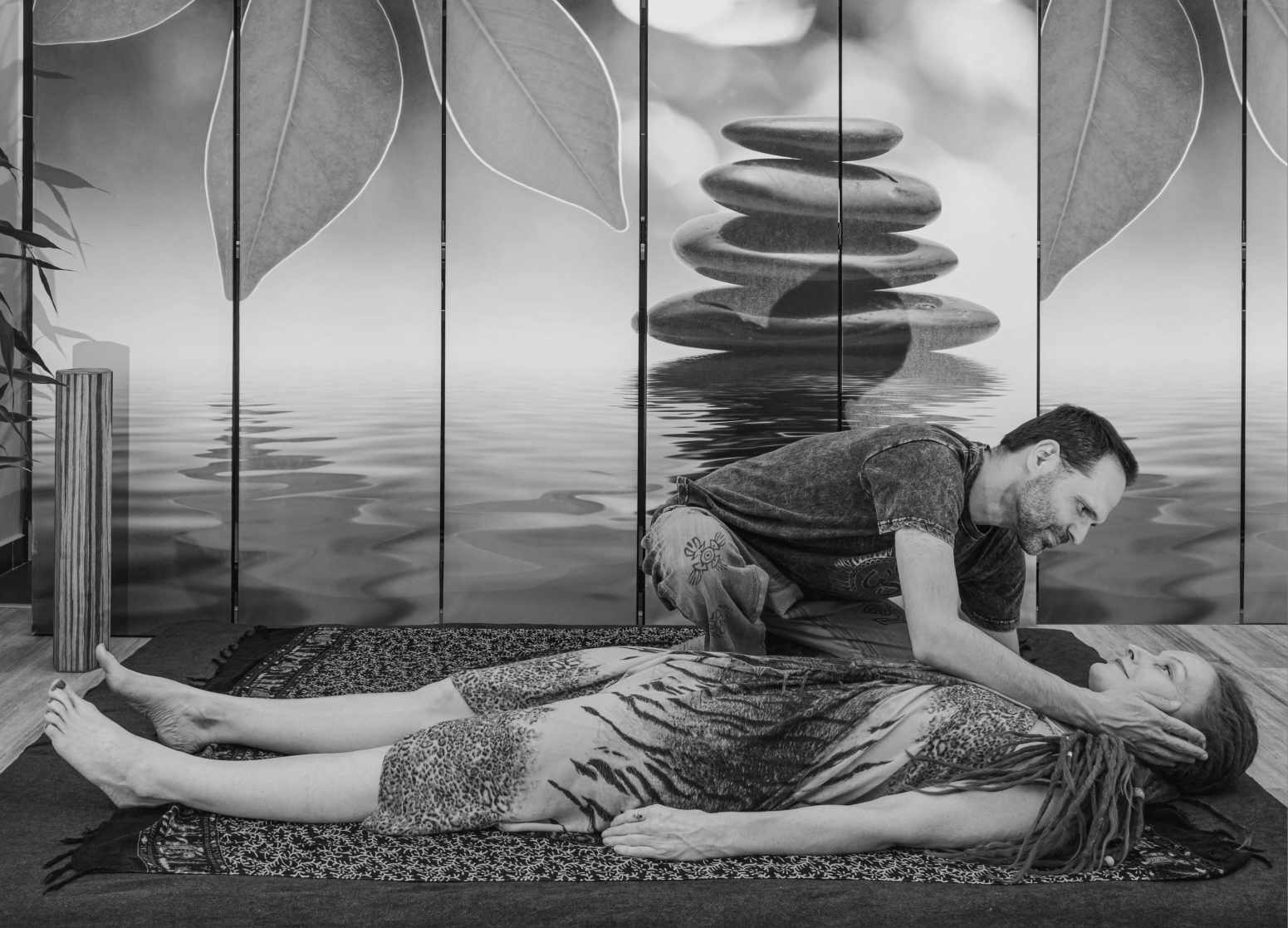 - Úvodní rituál před masáží - ladění se na partnera/partnerku, práce/manipulace se sárongem (šátkem)